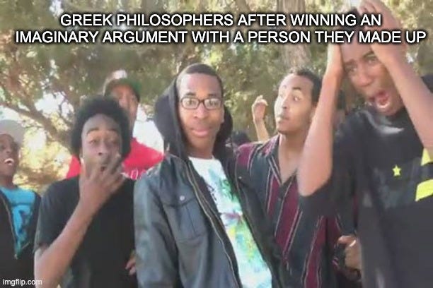 In one sense, we’re not the first to do this. There’s a storied tradition of The Dialogue as a genre, but from what I understand, those were normally just one ancient Greek guy creating imaginary opponents he could dunk on. So this is a bit different.